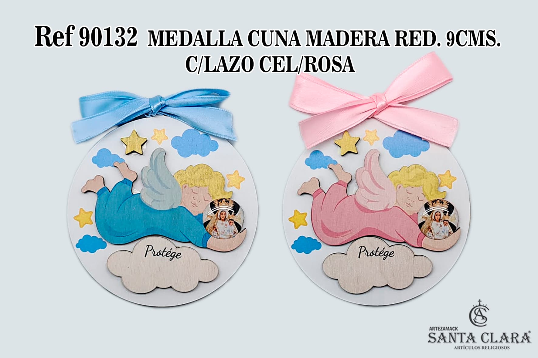 REF. 90132 – MEDALLA CUNA MADERA RED. 9CMS. CON LAZO CEL-ROSA